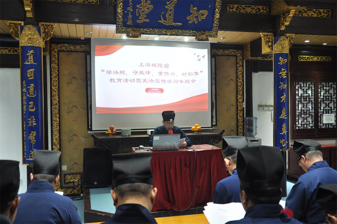 【上海城隍庙举行“学法规,守戒律,重修为,树形象”教育活动第二次集体学习暨宪法专题学习会】2025年12月4日下午,为持续深化教职人员思想政治教育,增强法治观念与社会主义核心价值观认同,根据“学法规,守戒律,重修为,树形象”教育活动安排并结合2025年宪法宣传学习周,上海城隍庙在知道堂举行