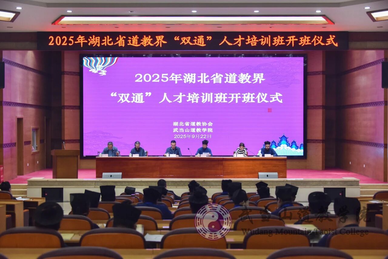 【2025年湖北省道教界“双通”人才培训班在武当山道教学院开班】2025年9月22日上午,为深入贯彻落实宗教中国化方向,加强湖北省道教人才队伍建设,2025年湖北省道教界“双通”人才培训班在武当山道教学院开班。 升国旗,唱国歌 丹江口市委统战部常务副部长杜昕,丹江口市宗教团体服务中心主任陈迪燚,