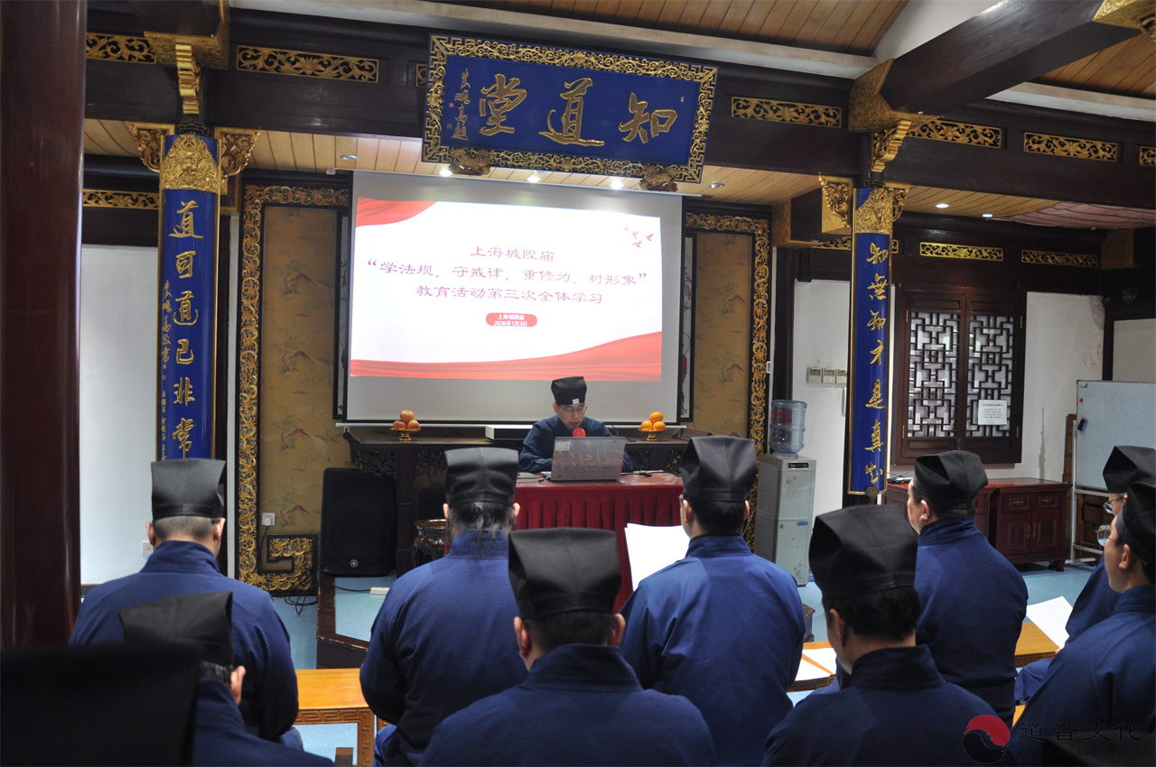 【上海城隍庙举行“学法规,守戒律,重修为,树形象”教育活动第三次集体学习】2026年1月3日下午,为持续加强教职人员思想政治教育,深化法治观念与社会主义核心价值观的实践认同,上海城隍庙在知道堂举行了“学法规,守戒律,重修为,树形象”教育活动第三次集体学习。全体在庙教职人员及职工参加学习