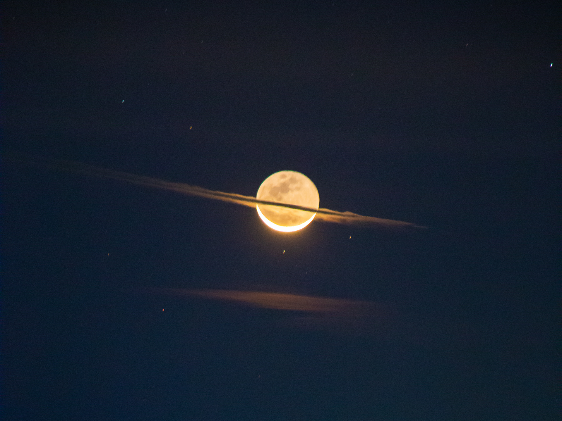 【月与云】@ Francisco Sojuel 星语 土星怎会这么大? 因为它不是土星,只是地球的浮云飘过月亮前方造成的景观。 当时月亮带着纤细的蛾眉相,其他大片的月面因反射地照光而散发暗淡的灰光。 受到太阳直接照耀的月表,只有底部的狭窄蛾眉亮区,因此太阳必然是在地平面下方,而且时值日出之前。 ... http